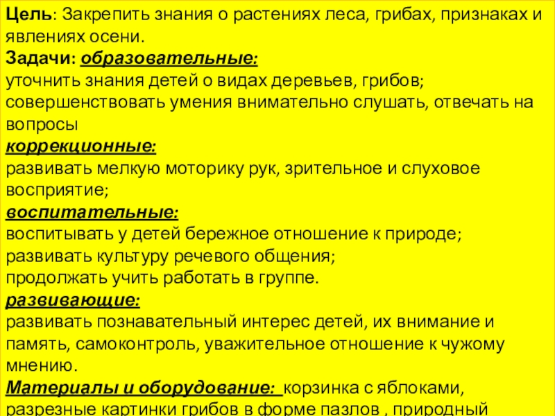 Слайд 3Цель: Закрепить знания о растениях леса, грибах, признаках и явлениях осени.