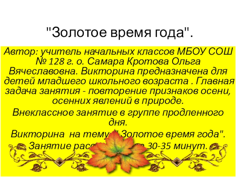 г. о. Самара Кротова Ольга Вячеславовна. Викторина предназначена для детей младшего школьного возраста . Главная задача занятия - повторение признаков осени, осенних явлений в природе.