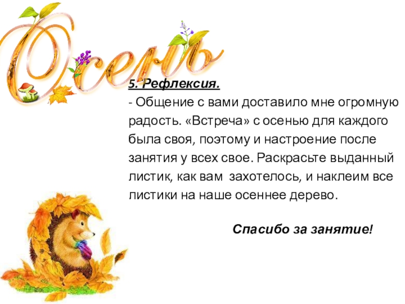 с осенью для каждого была своя, поэтому и настроение после занятия у всех свое. Раскрасьте выданный листик, как вам захотелось, и наклеим все листики на наше осеннее дерево.