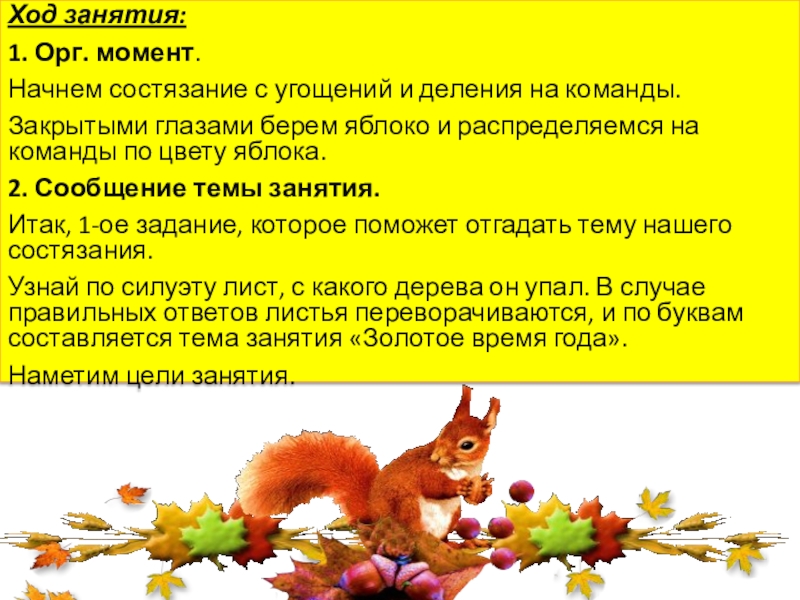 Узнай по силуэту лист, с какого дерева он упал. В случае правильных ответов листья переворачиваются, и по буквам составляется тема занятия «Золотое время года».