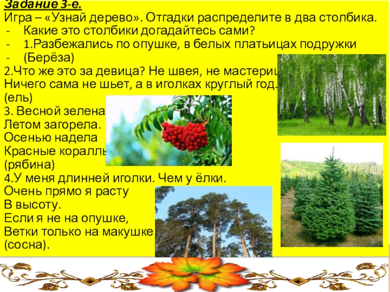 Игра – «Узнай дерево». Отгадки распределите в два столбика.