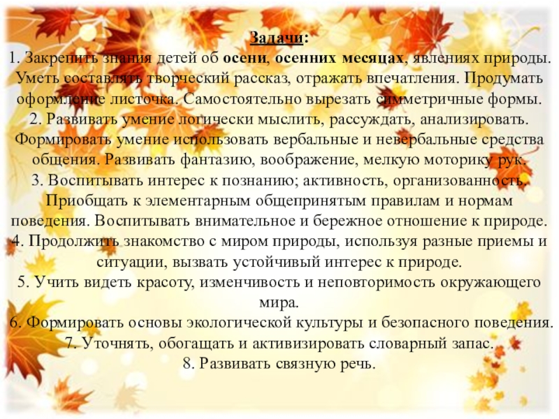 Слайд 4Задачи: 1. Закрепить знания детей об осени, осенних месяцах, явлениях природы. Уметь