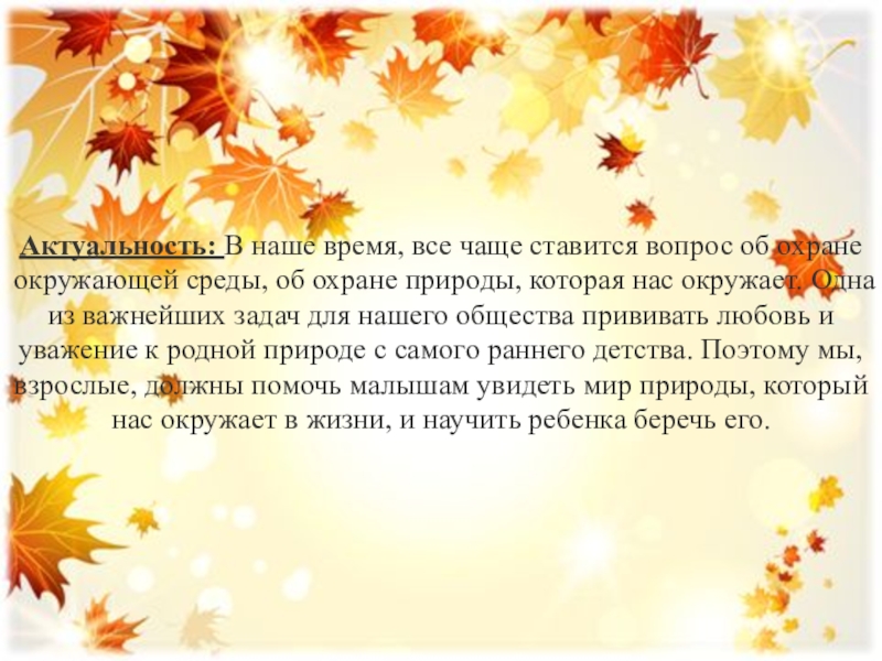 Актуальность: В наше время, все чаще ставится вопрос об охране окружающей среды, об охране природы, которая нас окружает. Одна из важнейших задач для нашего общества прививать любовь и уважение к родной природе с самого раннего детства.
