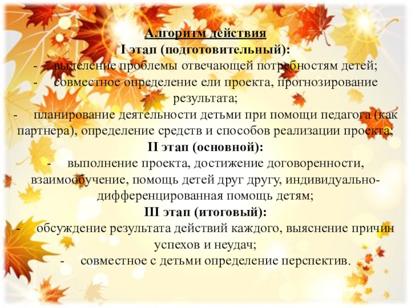 Алгоритм действия  I этап (подготовительный): -	выделение проблемы отвечающей потребностям детей; -	совместное определение ели проекта, прогнозирование результата;