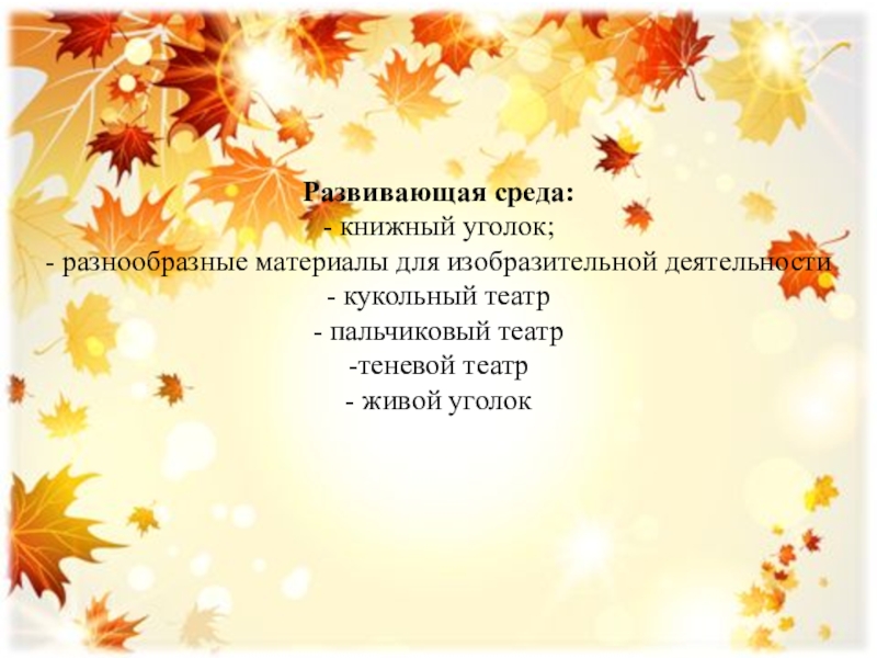 Слайд 7Развивающая среда: - книжный уголок; - разнообразные материалы для изобразительной деятельности - кукольный