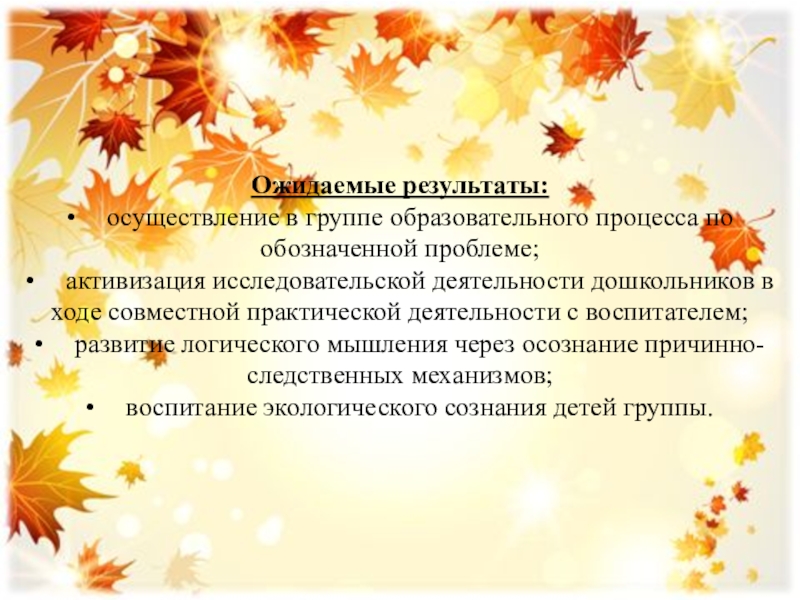 Ожидаемые результаты: •	осуществление в группе образовательного процесса по обозначенной проблеме; •	активизация исследовательской деятельности дошкольников в ходе совместной
