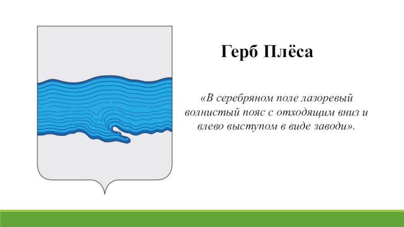 Герб Плёса«В серебряном поле лазоревый волнистый пояс с отходящим вниз и влево выступом в виде заводи».