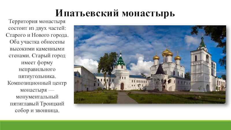 Ипатьевский монастырьТерритория монастыря состоит из двух частей: Старого и Нового города. Оба участка обнесены высокими каменными стенами.
