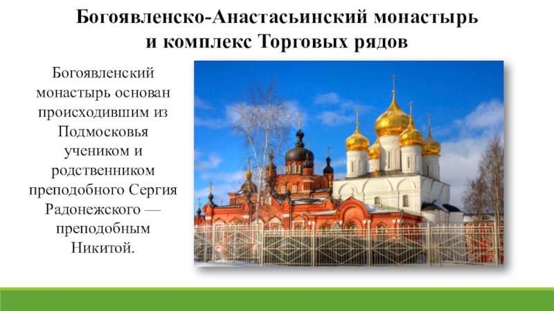Богоявленско-Анастасьинский монастырь  и комплекс Торговых рядовБогоявленский монастырь основан происходившим из Подмосковья учеником и родственником преподобного Сергия