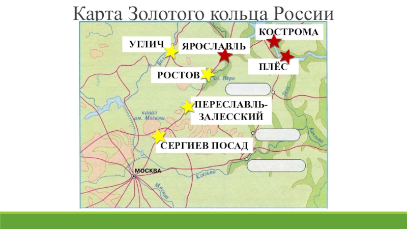 Карта Золотого кольца РоссииУГЛИЧСЕРГИЕВ ПОСАДПЕРЕСЛАВЛЬ-ЗАЛЕССКИЙ РОСТОВПЛЁСЯРОСЛАВЛЬКОСТРОМА
