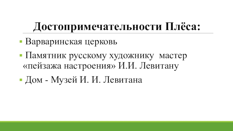 Достопримечательности Плёса: Варваринская церковь Памятник русскому художнику мастер «пейзажа настроения» И.И. Левитану Дом - Музей И. И.