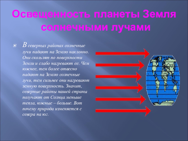 Освещенность планеты Земля  солнечными лучамиВ северных районах солнечные лучи падают на Землю наклонно. Они скользят по