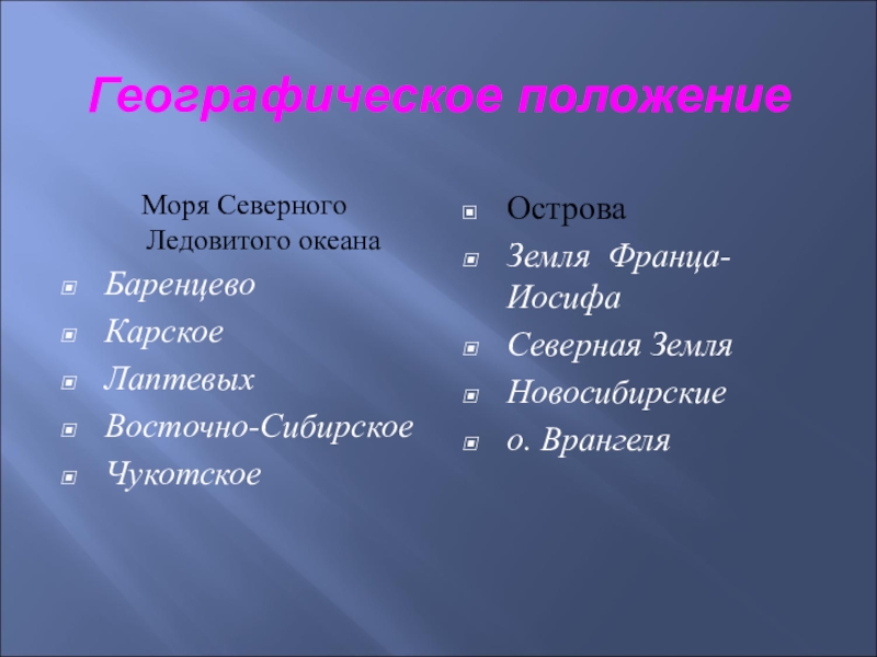 Географическое положениеМоря Северного Ледовитого океанаБаренцевоКарскоеЛаптевыхВосточно-СибирскоеЧукотскоеОстроваЗемля Франца-ИосифаСеверная ЗемляНовосибирскиео. Врангеля