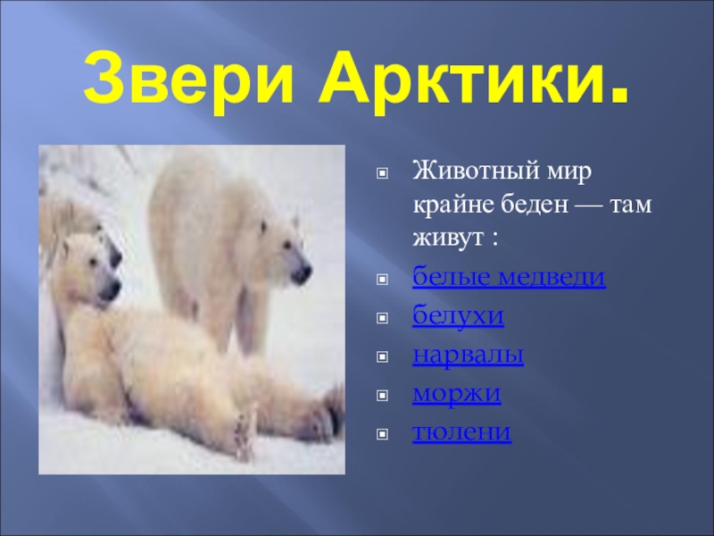 Звери Арктики.Животный мир крайне беден — там живут :белые медведи белухи нарвалы моржи тюлени