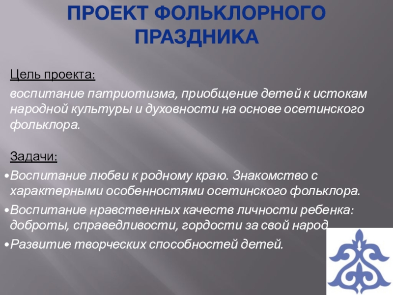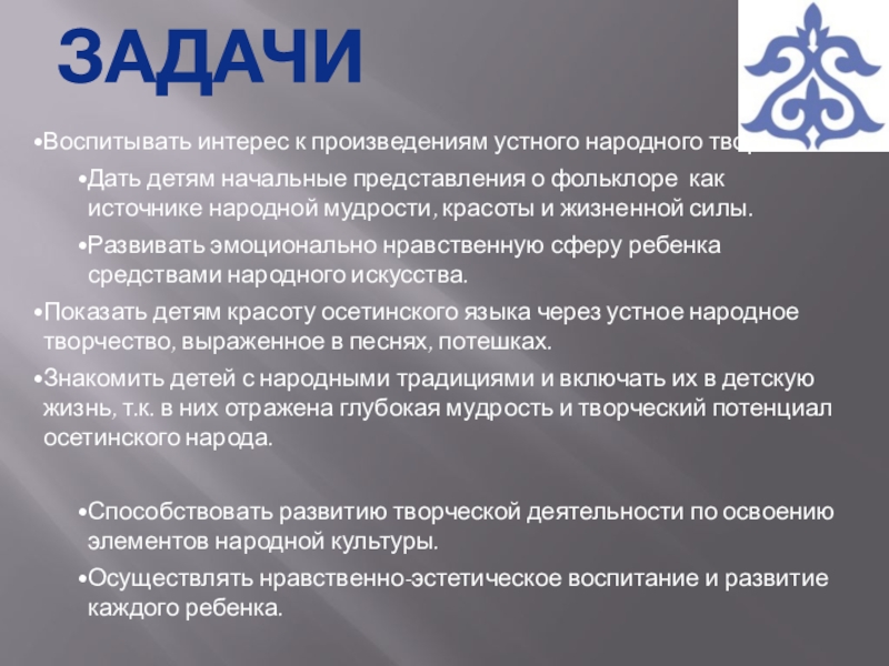 Показать детям красоту осетинского языка через устное народное творчество, выраженное в песнях, потешках.