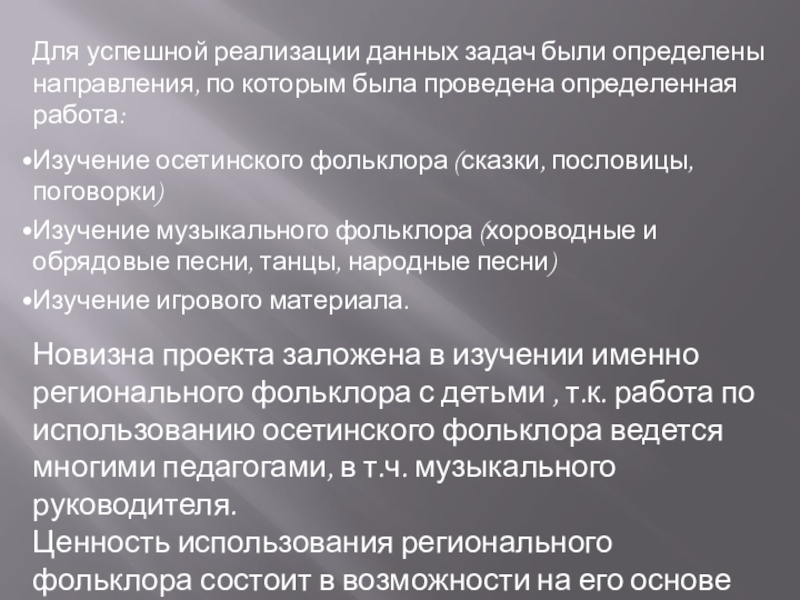 Новизна проекта заложена в изучении именно регионального фольклора с детьми , т.к. работа по использованию осетинского фольклора ведется многими педагогами, в т.ч. музыкального руководителя.