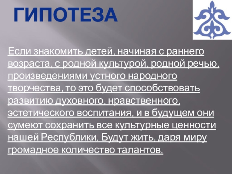 речью, произведениями устного народного творчества, то это будет способствовать развитию духовного, нравственного, эстетического воспитания, и в будущем они сумеют сохранить все культурные ценности нашей Республики. Будут жить, даря миру громадное количество талантов.