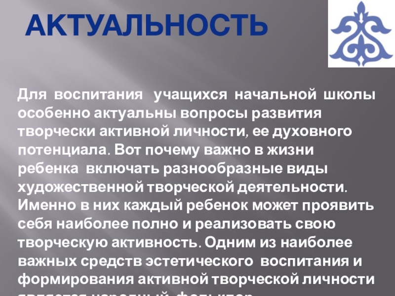 творчески активной личности, ее духовного потенциала. Вот почему важно в жизни ребенка включать разнообразные виды художественной творческой деятельности. Именно в них каждый ребенок может проявить себя наиболее полно и реализовать свою творческую активность. Одним из наиболее важных средств эстетического воспитания и формирования активной творческой личности является народный фольклор.
