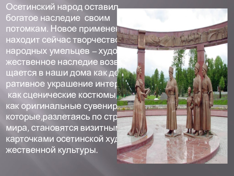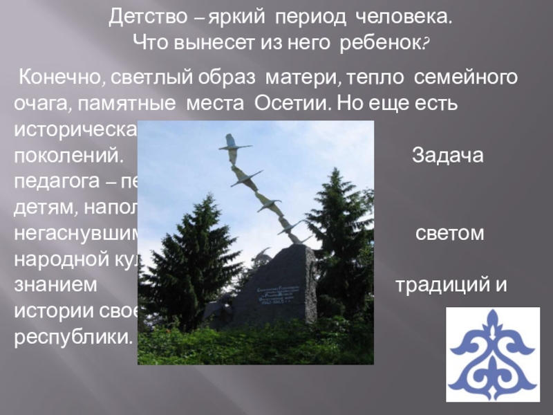 светлый образ матери, тепло семейного очага, памятные места Осетии. Но еще есть историческая память поколений. Задача педагога – передать ее детям, наполнить их сердца негаснувшим светом народной культуры, знанием традиций и истории своей республики.