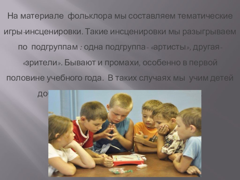 Слайд 14На материале фольклора мы составляем тематические игры-инсценировки. Такие инсценировки мы разыгрываем