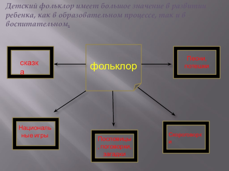 Слайд 13Детский фольклор имеет большое значение в развитии ребенка, как в образовательном