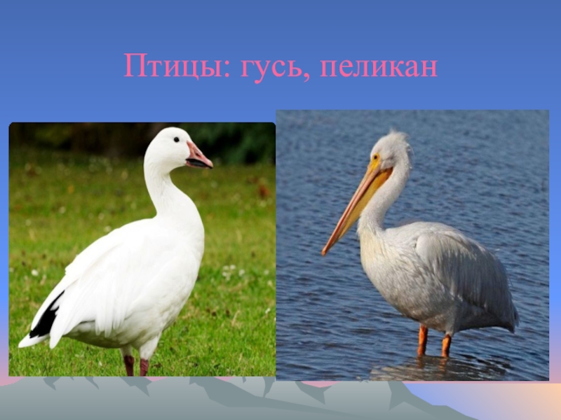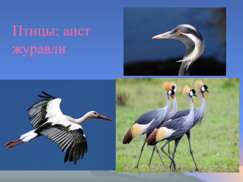 Утка, аист и лебедь — водяные птицы. Птицы, такие как павлин и петух, не могут летать высоко. Птицы, такие как орел, стервятник, коршун и ястреб, могут летать очень высоко в небе. Некоторые не могут летать— пингвин.