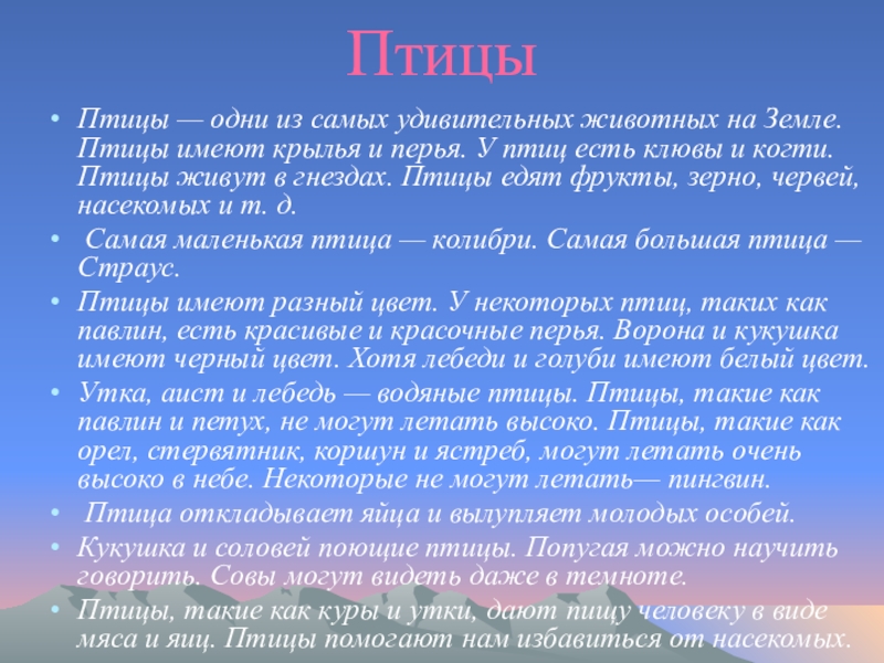 крылья и перья. У птиц есть клювы и когти. Птицы живут в гнездах. Птицы едят фрукты, зерно, червей, насекомых и т. д.