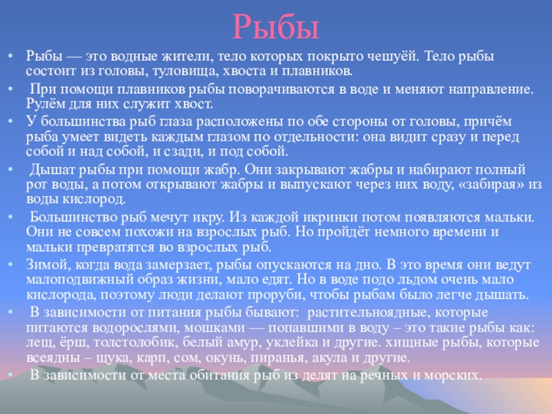 Рыбы — это водные жители, тело которых покрыто чешуёй. Тело рыбы