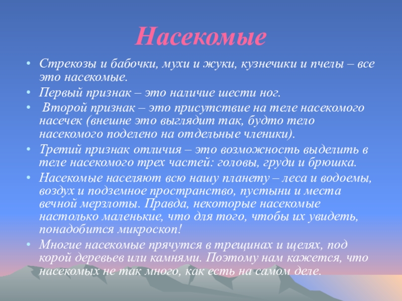 Насекомые населяют всю нашу планету – леса и водоемы, воздух и подземное пространство, пустыни и места вечной мерзлоты. Правда, некоторые насекомые настолько маленькие, что для того, чтобы их увидеть, понадобится микроскоп!