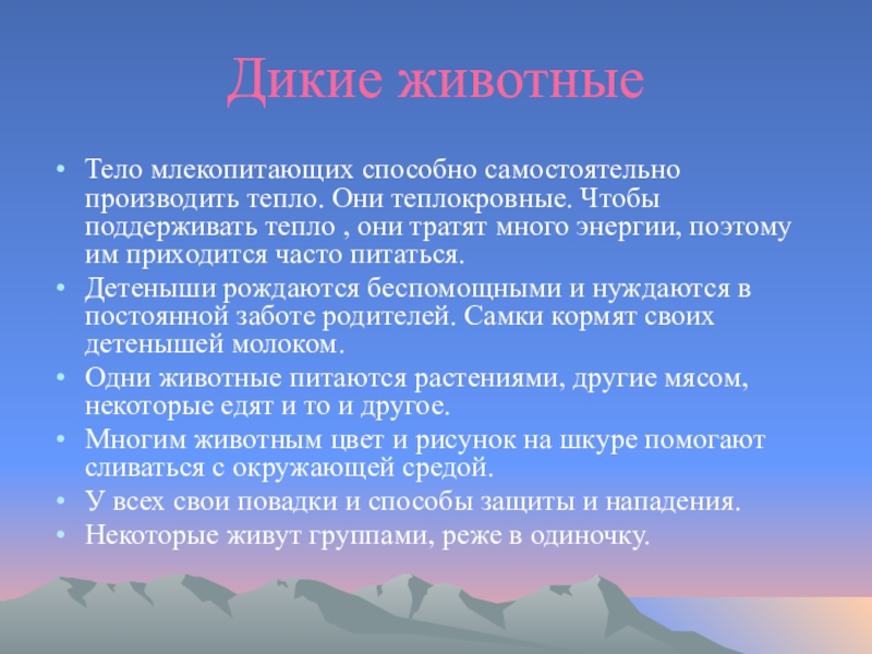 Тело млекопитающих способно самостоятельно производить тепло. Они теплокровные. Чтобы поддерживать
