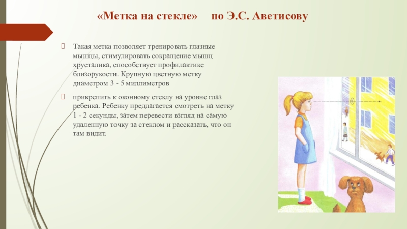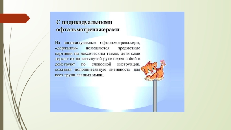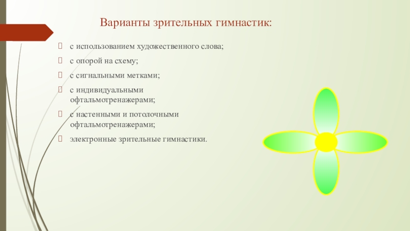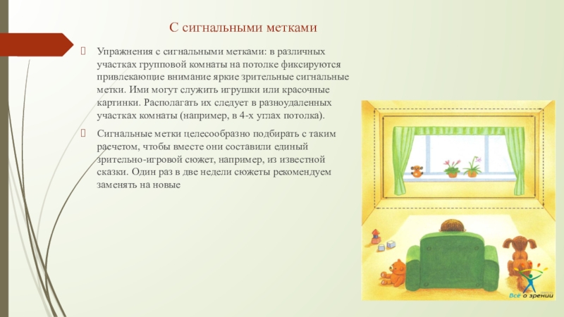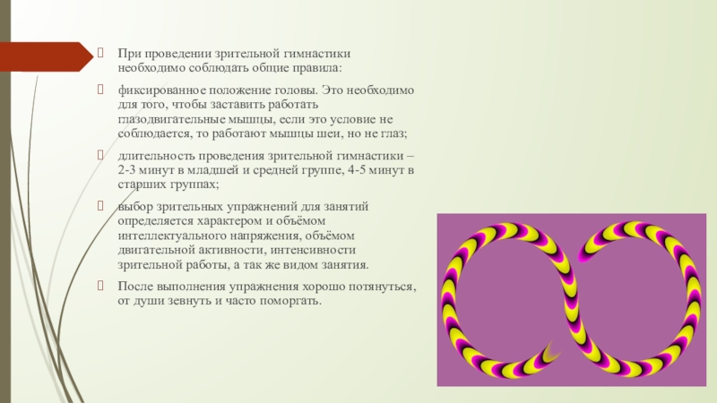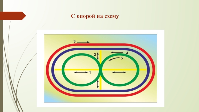 Это своего рода траектории, по которым дети «бегают» глазами; при этом движения глаз должны сочетаться с движением головы, туловища. Упражнения выполняются коллективно и только стоя. Каждая траектория отличается по цвету, это делает схему яркой, привлекает внимание детей.