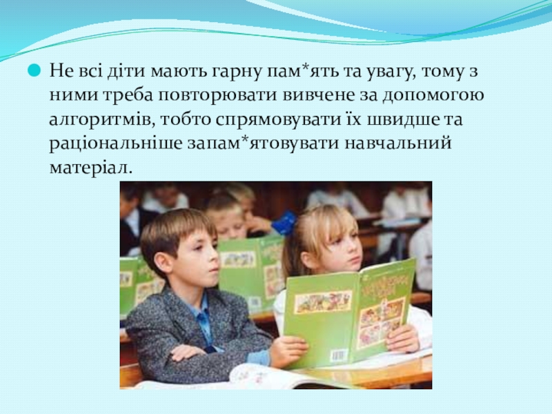 треба повторювати вивчене за допомогою алгоритмів, тобто спрямовувати їх швидше та раціональніше запам*ятовувати навчальний матеріал.