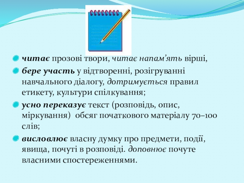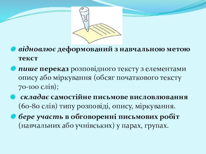 усно переказує текст (розповідь, опис, міркування) обсяг початкового матеріалу 70–100 слів