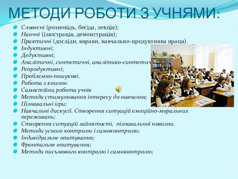 Слайд 3МЕТОДИ РОБОТИ З УЧНЯМИ: