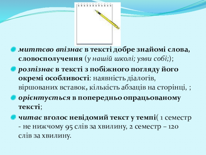 Слайд 7миттєво впізнає в тексті добре знайомі слова, словосполучення (у нашій школі