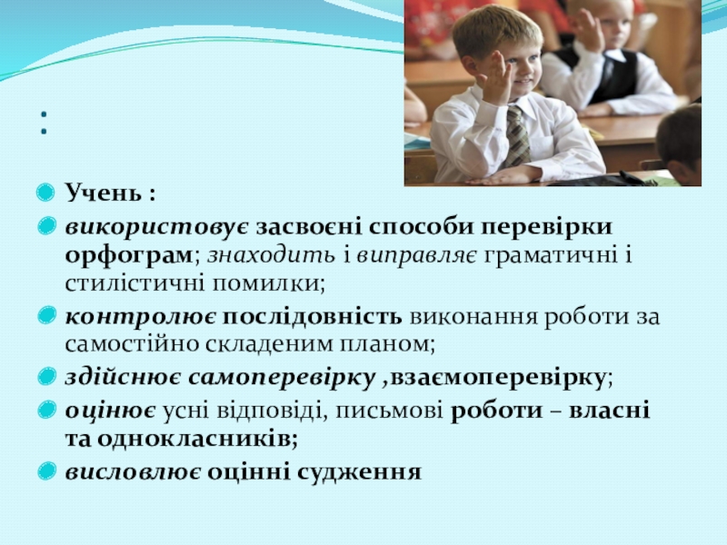 використовує засвоєні способи перевірки орфограм; знаходить і виправляє граматичні і