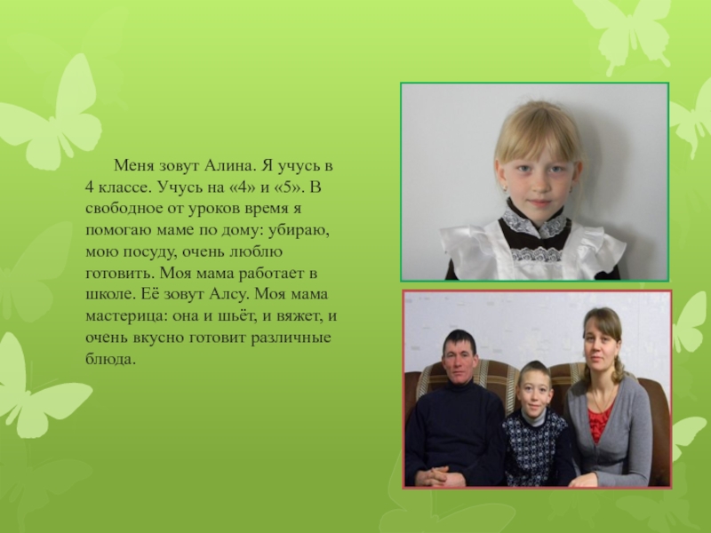 Учусь на «4» и «5». В свободное от уроков время я помогаю маме по дому: убираю, мою посуду, очень люблю готовить. Моя мама работает в школе. Её зовут Алсу. Моя мама мастерица: она и шьёт, и вяжет, и очень вкусно готовит различные блюда.