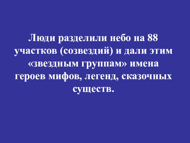 Люди разделили небо на 88 участков (созвездий) и дали этим «звездным группам» имена героев мифов, легенд, сказочных