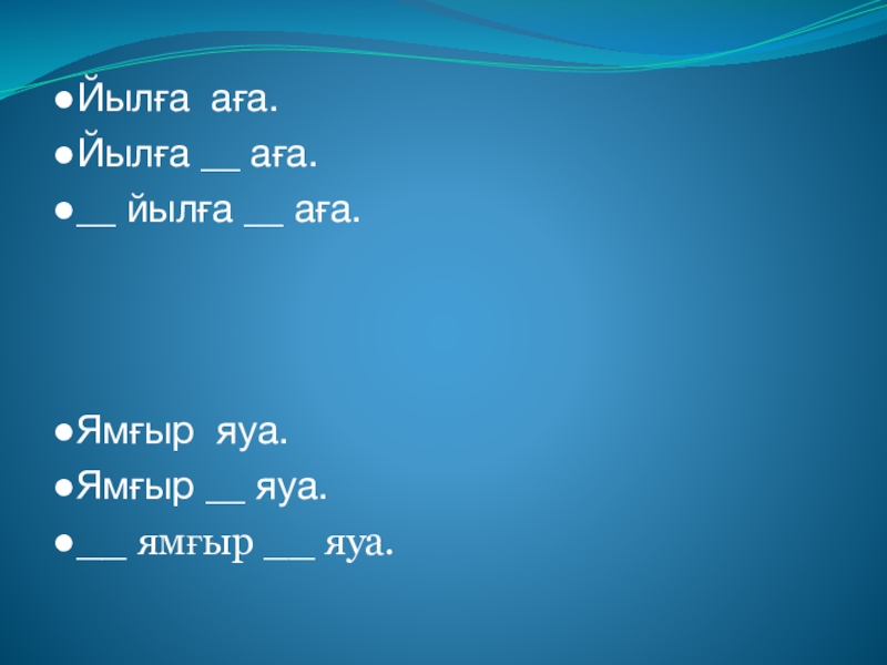 ●Йылға аға. ●Йылға __ аға.●__ йылға __ аға.●Ямғыр яуа.●Ямғыр __ яуа.●__ ямғыр __ яуа.