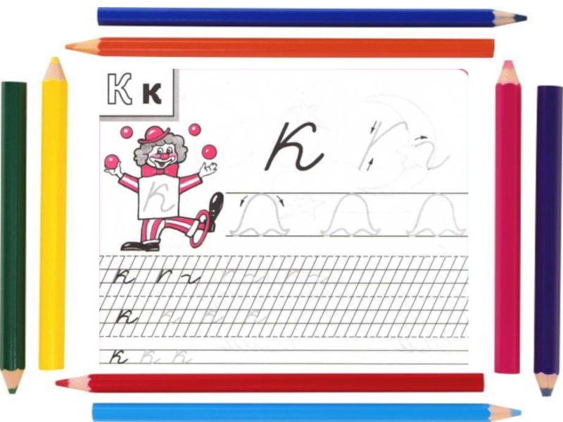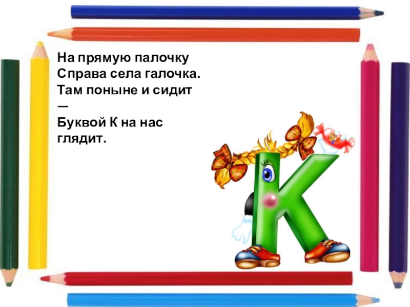 Слайд 5На прямую палочку  Справа села галочка.  Там поныне и сидит — Буквой К на