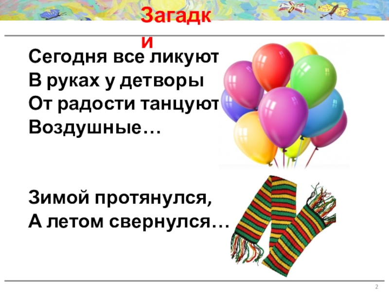 ЗагадкиСегодня все ликуют!В руках у детворыОт радости танцуютВоздушные…Зимой протянулся,А летом свернулся…