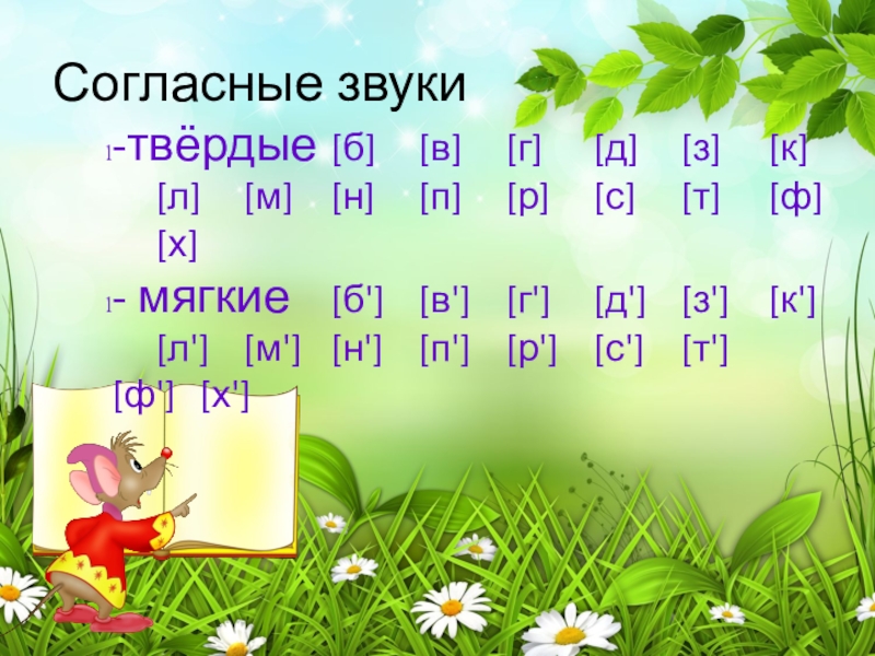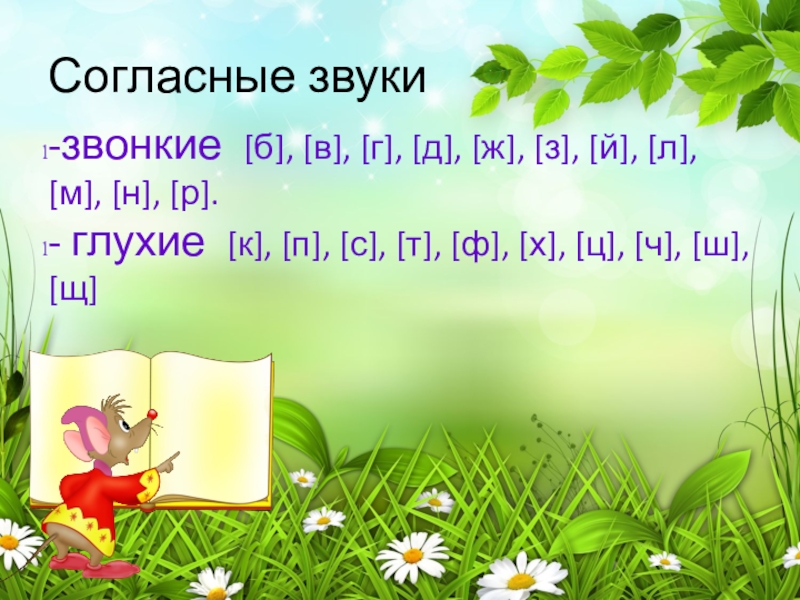 Согласные звуки-звонкие [б], [в], [г], [д], [ж], [з], [й], [л], [м], [н], [р].- глухие [к], [п], [с],