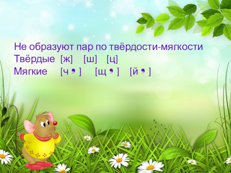 Не образуют пар по твёрдости-мягкостиТвёрдые 	[ж] 	[ш] 	[ц]Мягкие 	[ч❜] 	[щ❜] 	[й❜]