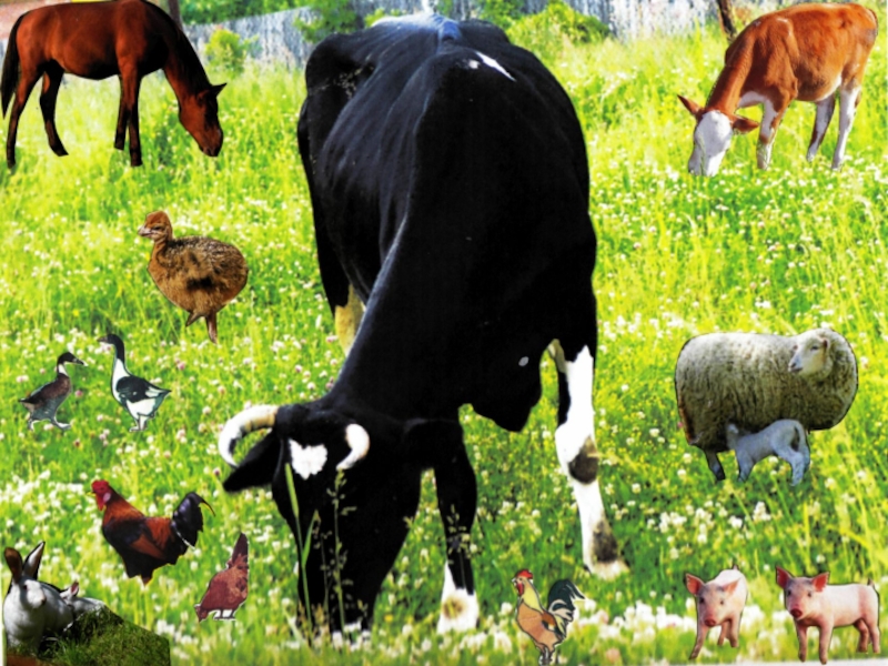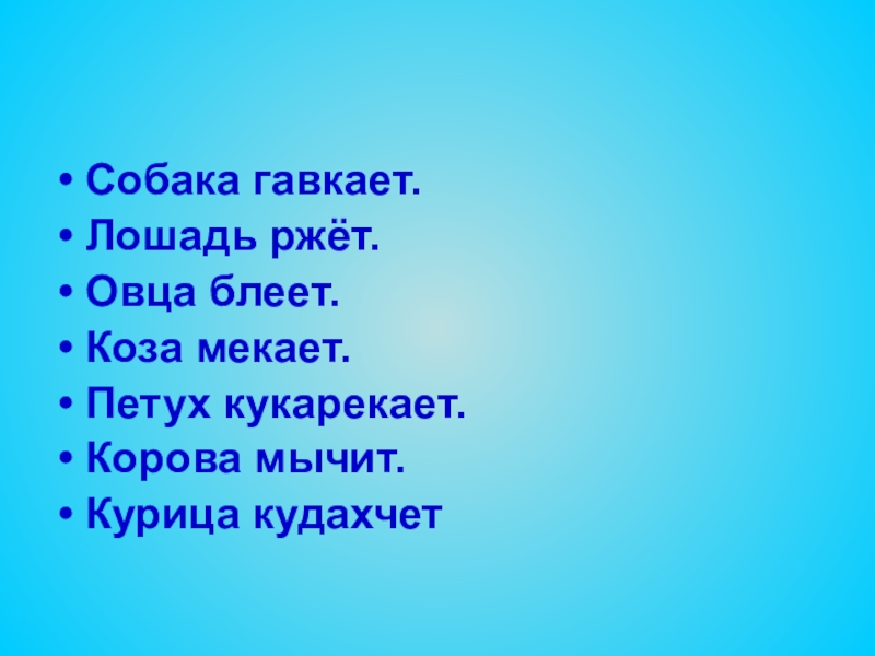 Собака гавкает.Лошадь ржёт.Овца блеет.Коза мекает.Петух кукарекает.Корова мычит.Курица кудахчет