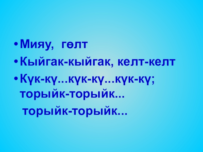 Мияу, гөлт   Кыйгак-кыйгак, келт-келтКүк-кү...күк-кү...күк-кү; торыйк-торыйк...  торыйк-торыйк...