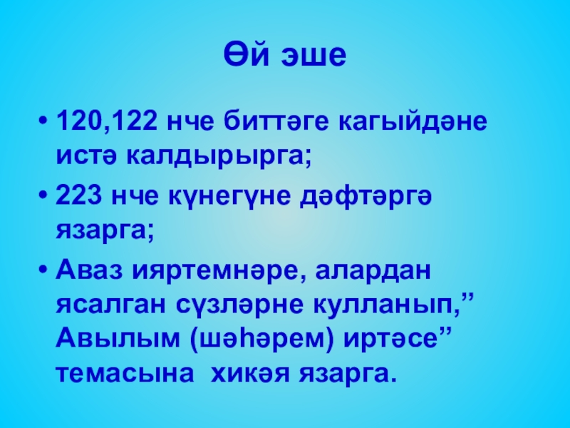 Өй эше120,122 нче биттәге кагыйдәне истә калдырырга;223 нче күнегүне дәфтәргә язарга;Аваз ияртемнәре, алардан ясалган сүзләрне кулланып,”Авылым (шәһәрем)