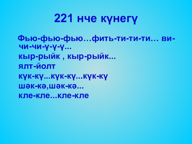 221 нче күнегү  Фью-фью-фью…фить-ти-ти-ти… ви-чи-чи-ү-ү-ү...  кыр-рыйк , кыр-рыйк...  ялт-йолт  күк-кү...күк-кү...күк-кү  шәк-кә,шәк-кә...
