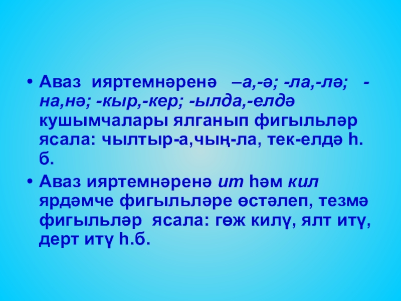 Аваз ияртемнәренә –а,-ә; -ла,-лә; -на,нә; -кыр,-кер; -ылда,-елдә кушымчалары ялганып