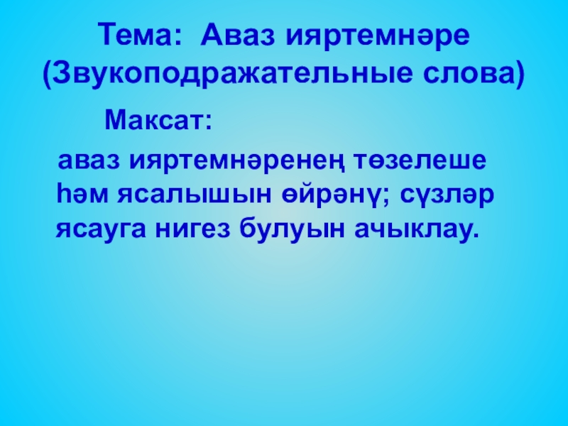 Тема: Аваз ияртемнәре (Звукоподражательные слова) Максат: аваз ияртемнәренең төзелеше һәм ясалышын өйрәнү; сүзләр ясауга нигез булуын ачыклау.