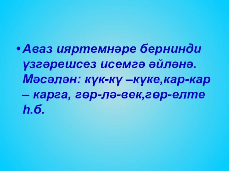Слайд 17Аваз ияртемнәре бернинди үзгәрешсез исемгә әйләнә.Мәсәлән: күк-кү –күке,кар-кар – карга, гөр-лә-век,гөр-елте